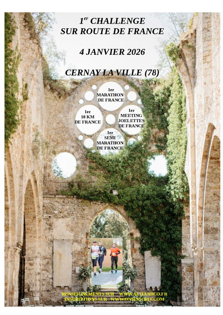 1er CHALLENGE SUR ROUTE DE FRANCE (marathon, semi, 10km) 4 JANVIER 2026 – traversera Pecqueuse par Villevert vers 11h00