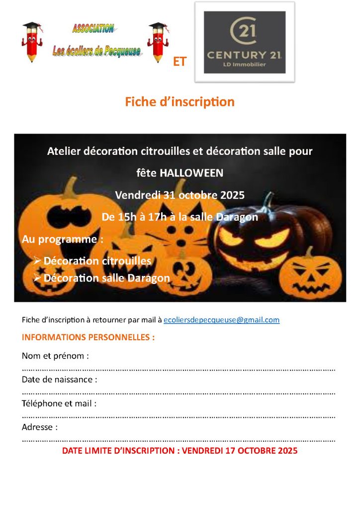 Atelier décoration citrouilles et décoration salle pour fête HALLOWEEN Vendredi 31 octobre 2025 De 15h à 17h à la salle Daragon