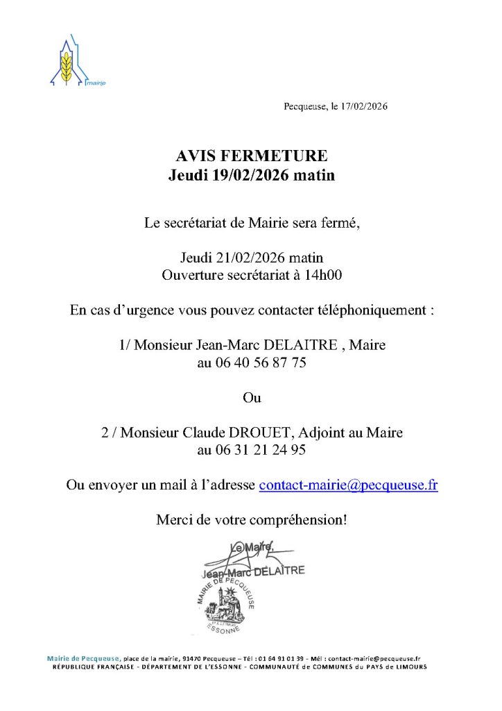avis de fermeture secrétariat mairie jeudi 19/02/2026