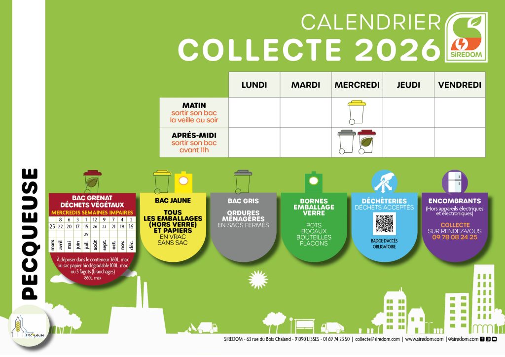 calendrier collecte rammassage SIREDOM année 2026 – ordures ménagères, recyclage et déchets végétaux