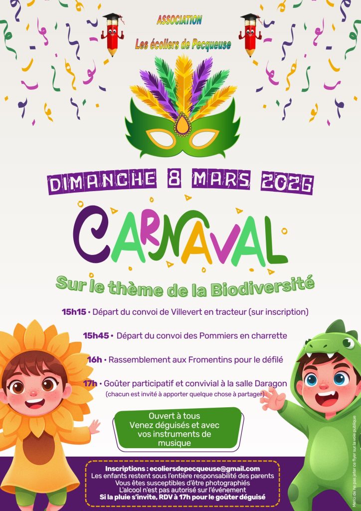 carnaval organisé par les écoliers de Pecqueuse sur le thème de la biodiversité : dimanche 8 mars 2026 15h – 18h