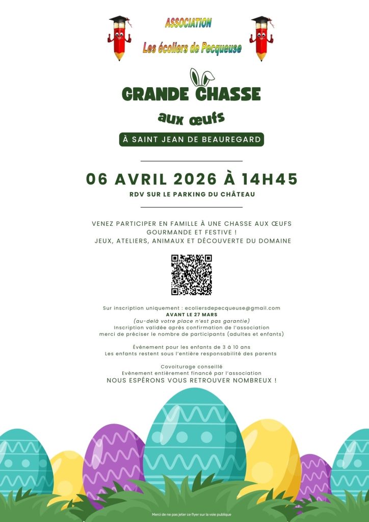 Grande chasse aux oeufs organisée par les écoliers de Pecqueuse à Saint Jean de Beauregard – lundi 6 avril à 14h45