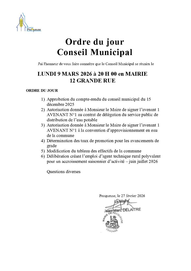ordre du jour conseil municipal du lundi 9 mars 2026 – 20h – 12 grande rue