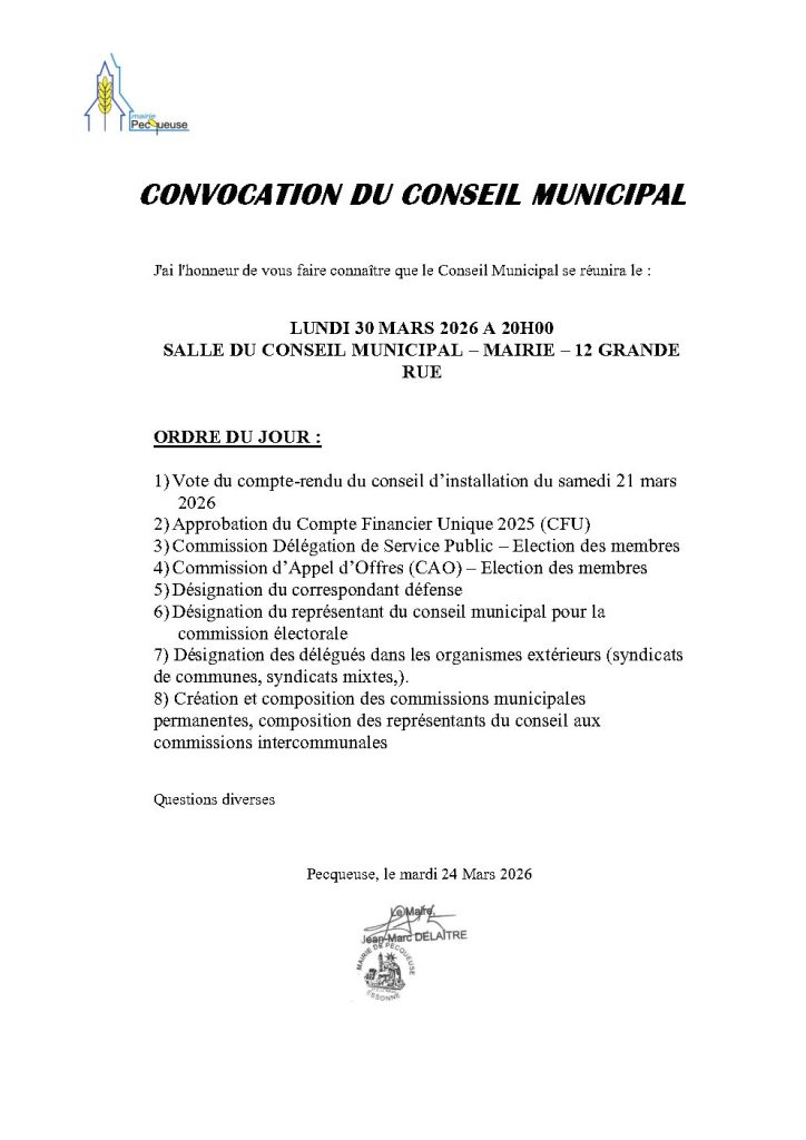 ordre du jour conseil municipal le lundi 30 mars 2026 à 20h00 – salle conseil municipal – mairie 12 grande rue
