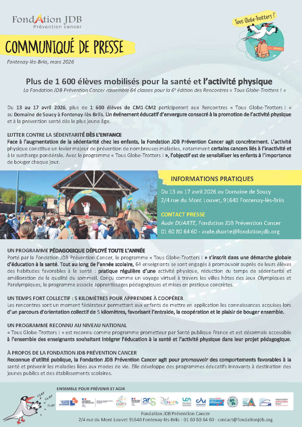 Du 13 au 17 avril 2026, les enfants de la classe de Madame SAGEAU du Ce1 au Cm2 participeront aux Rencontres « Tous Globe-Trotters ! » avec leur classe au Domaine de Soucy à Fontenay-lès-Briis, un événement éducatif consacré à la promotion de l’activité physique et à la prévention santé dès le plus jeune âge.